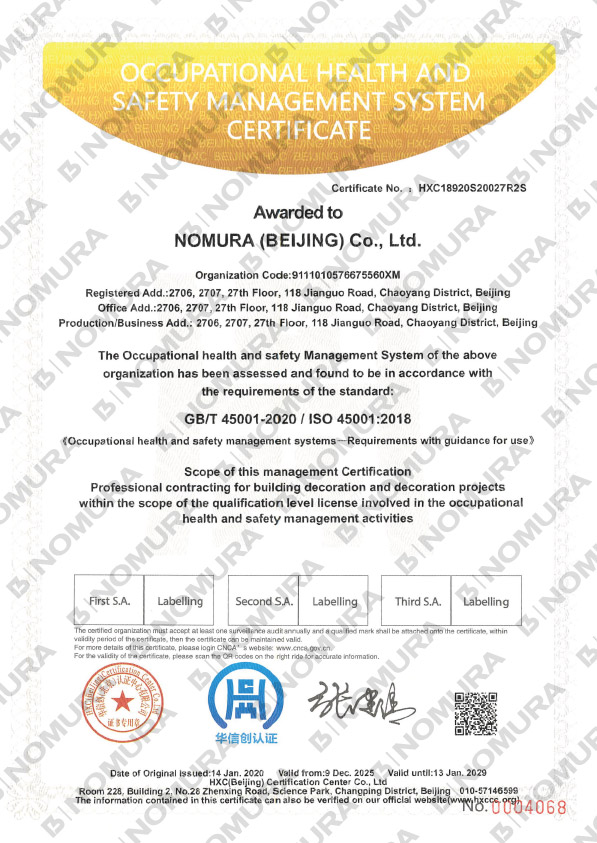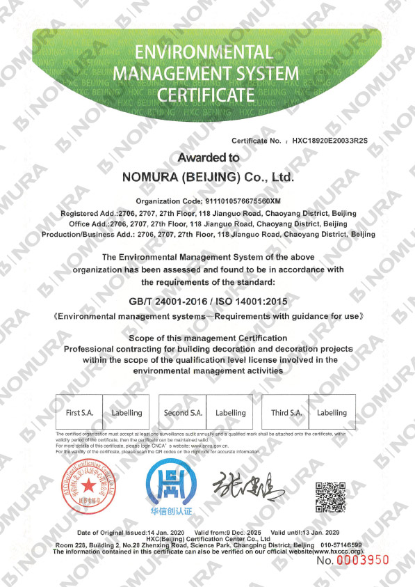 | Acquisition of certification | ・ISO9001 certification (Registration date: March 15, 2004, Renewal date: June 28, 2023, Expiration date: July 13, 2026) * NOMURA Ltd. (excluding overseas bases and AND Aoyama office) ・ISO14001 certification (Registration date: March 15, 2004, Renewal date: July 18, 2024, Expiration date: September 30, 2027) * NOMURA Ltd. (excluding overseas bases and AND Aoyama office) ・Privacy Mark certification obtained |